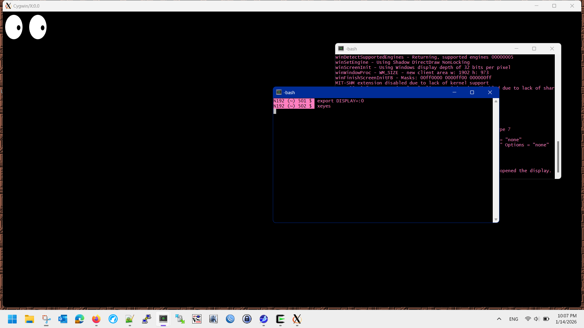 This should start the local xeyes application that was installed from the cygwin package repository.