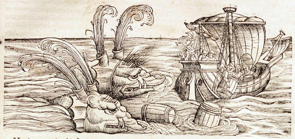 (Empty barrels of beer come in handy on a voyage in this woodcut illustration from Conard Gessner’s Historia animalium, Liber 4 of 1558)
