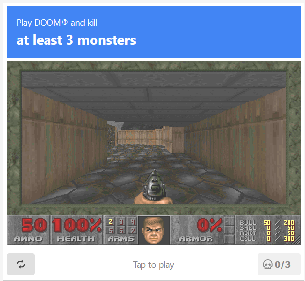 DOOM Captcha - "The project works by leveraging Emscripten to compile a minimal port of Doom to WebAssembly and enable intercommunication between the C-based game runloop (g_game.c) and the JavaScript-based CAPTCHA UI." - https://doom-captcha.vercel.app/
