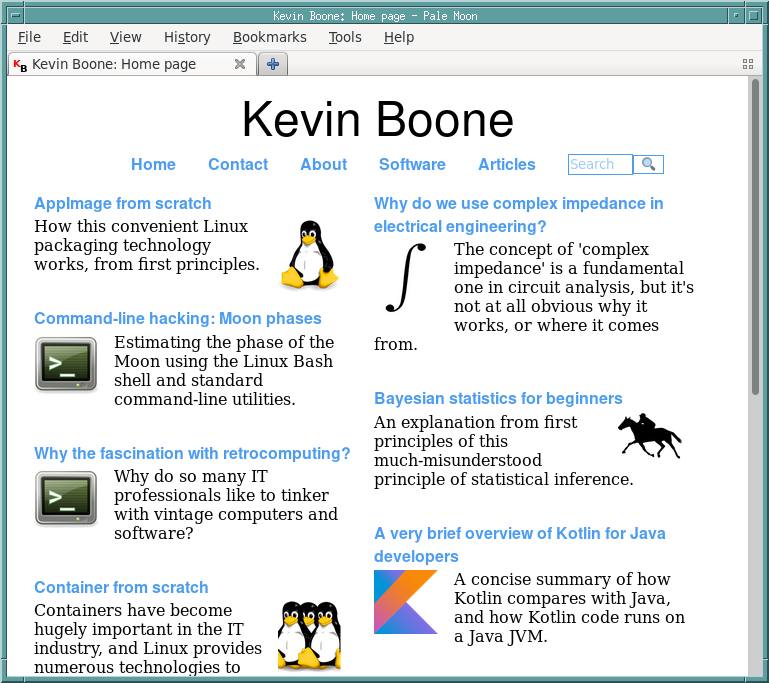 I really like personal homepages and have quite a list of them bookmarked. I'll post one every week unless I fall behind this schedule. 😉 So here's Cool Personal Homepages #CPH Vol. 64: "Kevin Boone: Home page"